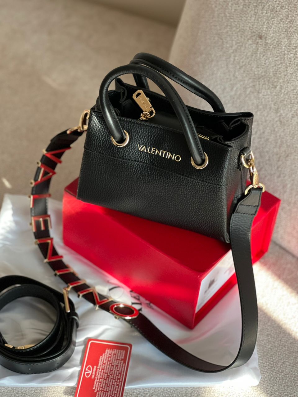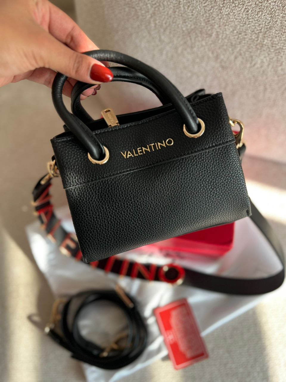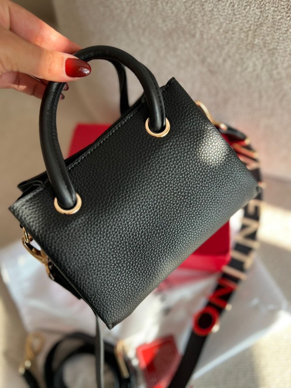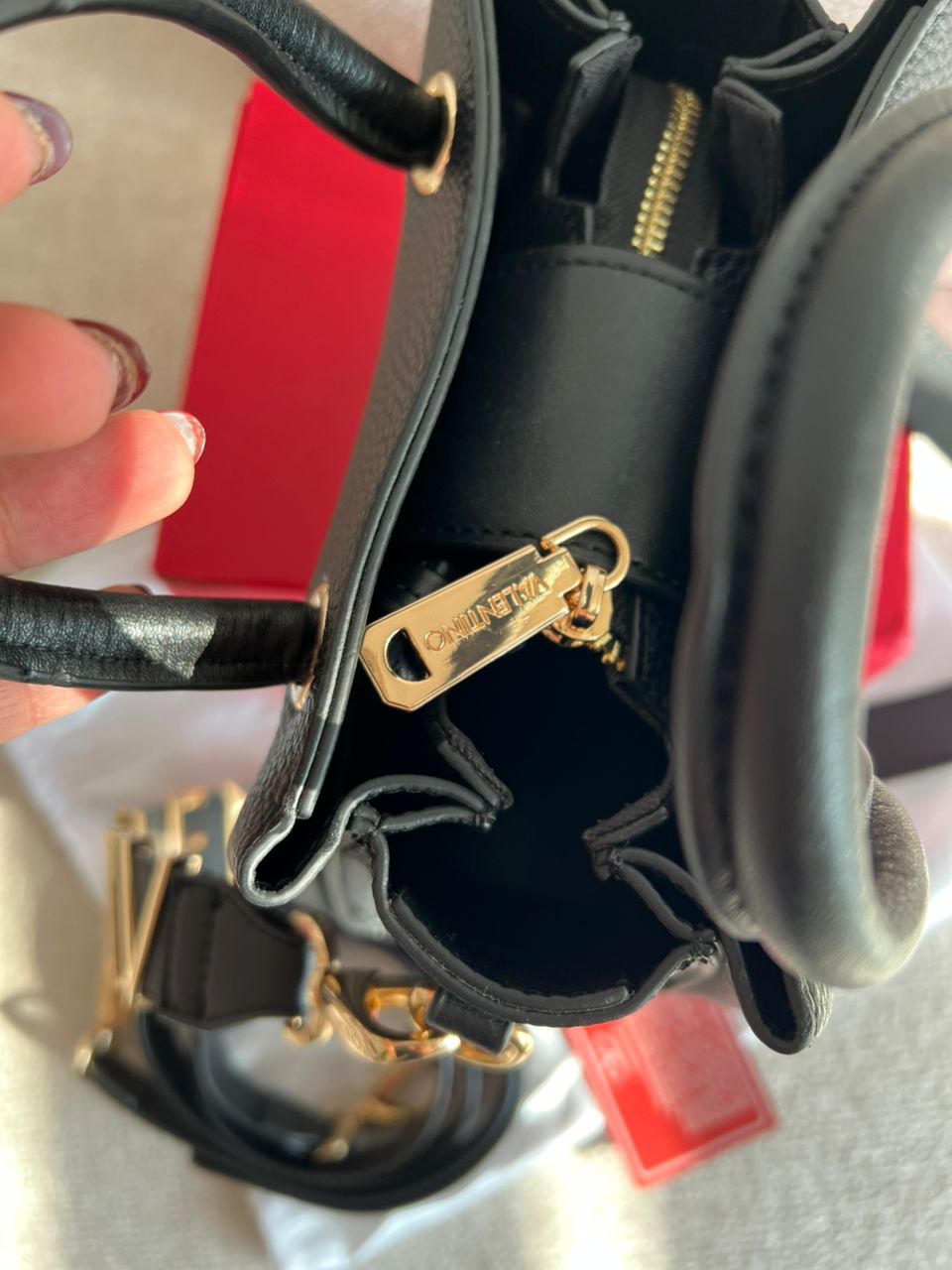 کیف مینی از برند ولنتینو . دارای دو بند بلند هست یکی از بند ها روش سگک ولنتینو دارد . یکی دیگش بند چرمی ساده بلند هست. یکی از سوالات متداول گوشی داخلش جا میشود .